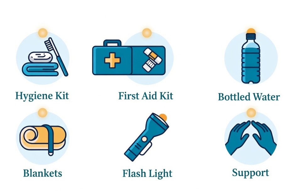 Disaster preparedness kits are essential for ensuring safety and comfort during emergencies. These kits include a hygiene kit with items such as soap, toothbrush, toothpaste, and sanitary products to maintain cleanliness. A first aid kit is also crucial, containing bandages, antiseptics, pain relievers, and any necessary medications to treat minor injuries. Additionally, the kit typically includes bottled water, a flashlight with extra batteries, a multi-tool, blankets, and important documents sealed in waterproof bags. Having these supplies ready can make a significant difference in managing natural disasters.